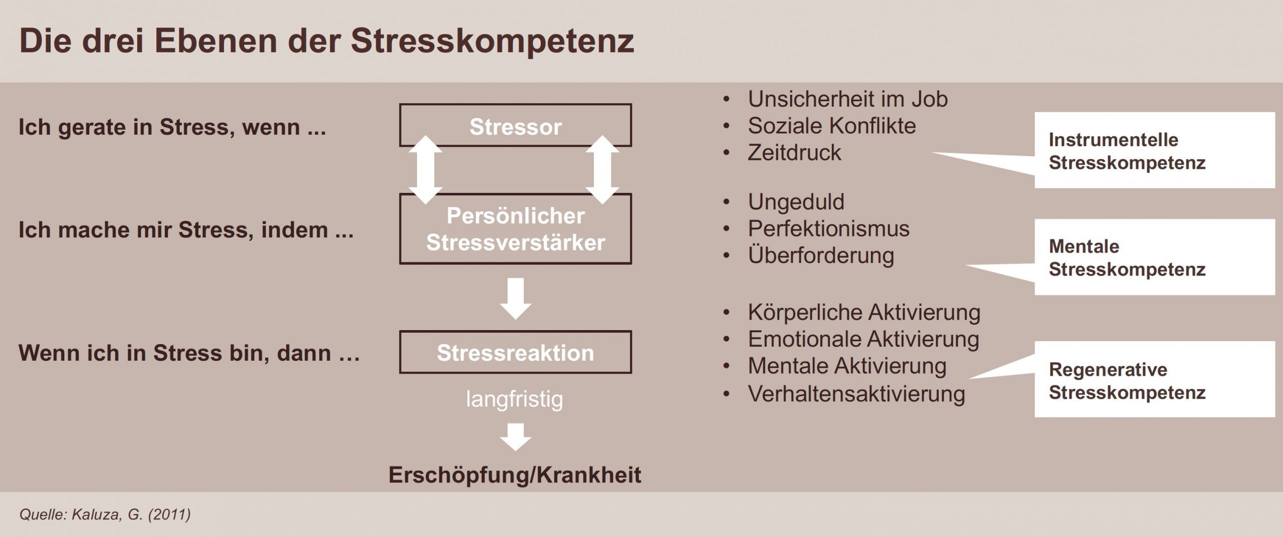 Nach dem Modell der Stressampel zeigt sich das Stressgeschehen auf verschiedenen Ebenen. Wenn es nun darum geht, einen konstruktiven Umgang mit dem Stress zu finden, lässt es sich auf eben diesen Ebenen ansetzen. Man spricht hier auch von instrumenteller, mentaler und regenerativer Stresskompetenz.