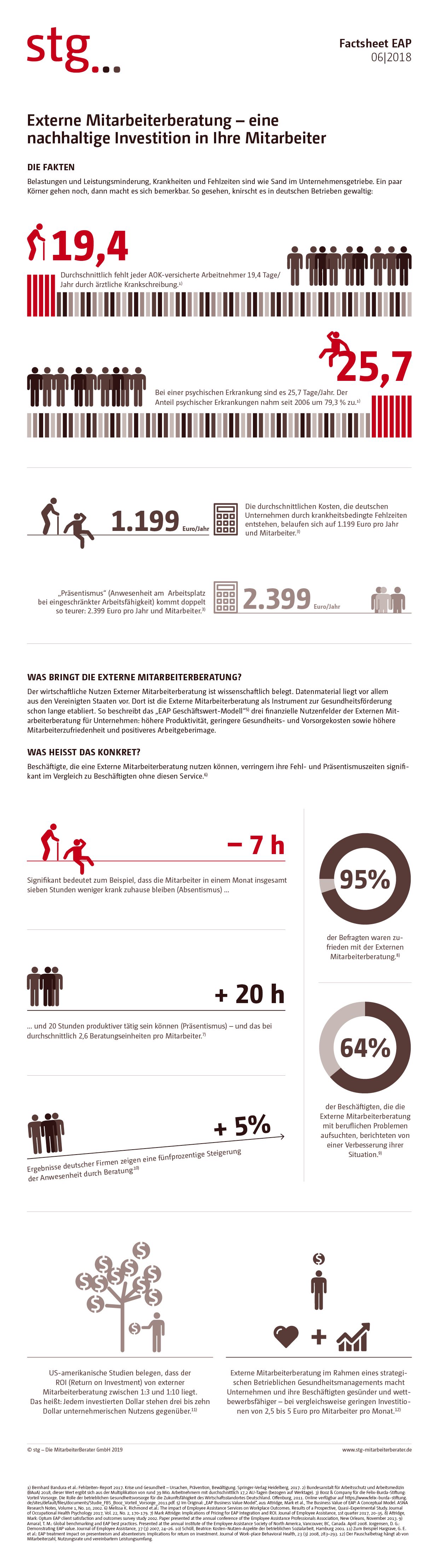 US-amerikanische Studien belegen, dass das Return on Investment (ROI) von externer Mitarbeiterberatung (EAP) zwischen 1:3 und 1:10 liegt. Das heißt: jedem investierten Dollar stehen drei bis zehn Dollar unternehmerischen Nutzens gegenüber. Externe Mitarbeiterberatung im Rahmen eines strategischen Betrieblichen Gesundheitsmanagements macht Unternehmen und ihre Beschäftigten gesünder und wettbewerbsfähiger – bei vergleichsweise geringen Investitionen von 2,5 bis 5 Euro pro Mitarbeiter pro Monat.