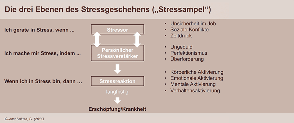 Einen guten Überblick gibt die sogenannte Stressampel. Danach lassen sich bei einem akuten Stressgeschehen immer drei Ebenen unterscheiden: