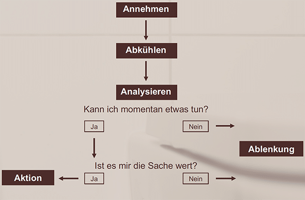 Wichtig ist auch wieder die bewusste Entscheidung für das Abkühlen (und damit gegen das Hineinsteigern in die Erregung). Manchmal reicht bereits ein bewusstes, verlängertes Ausatmen. In anderen Situationen sind kurze Entspannungs- oder Bewegungsübungen hilfreich.