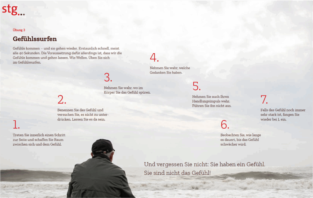 Schon das bloße Wahrnehmen eines Gefühls, wie es ist (ohne es zu bewerten), schafft Abstand und sorgt für Entlastung.